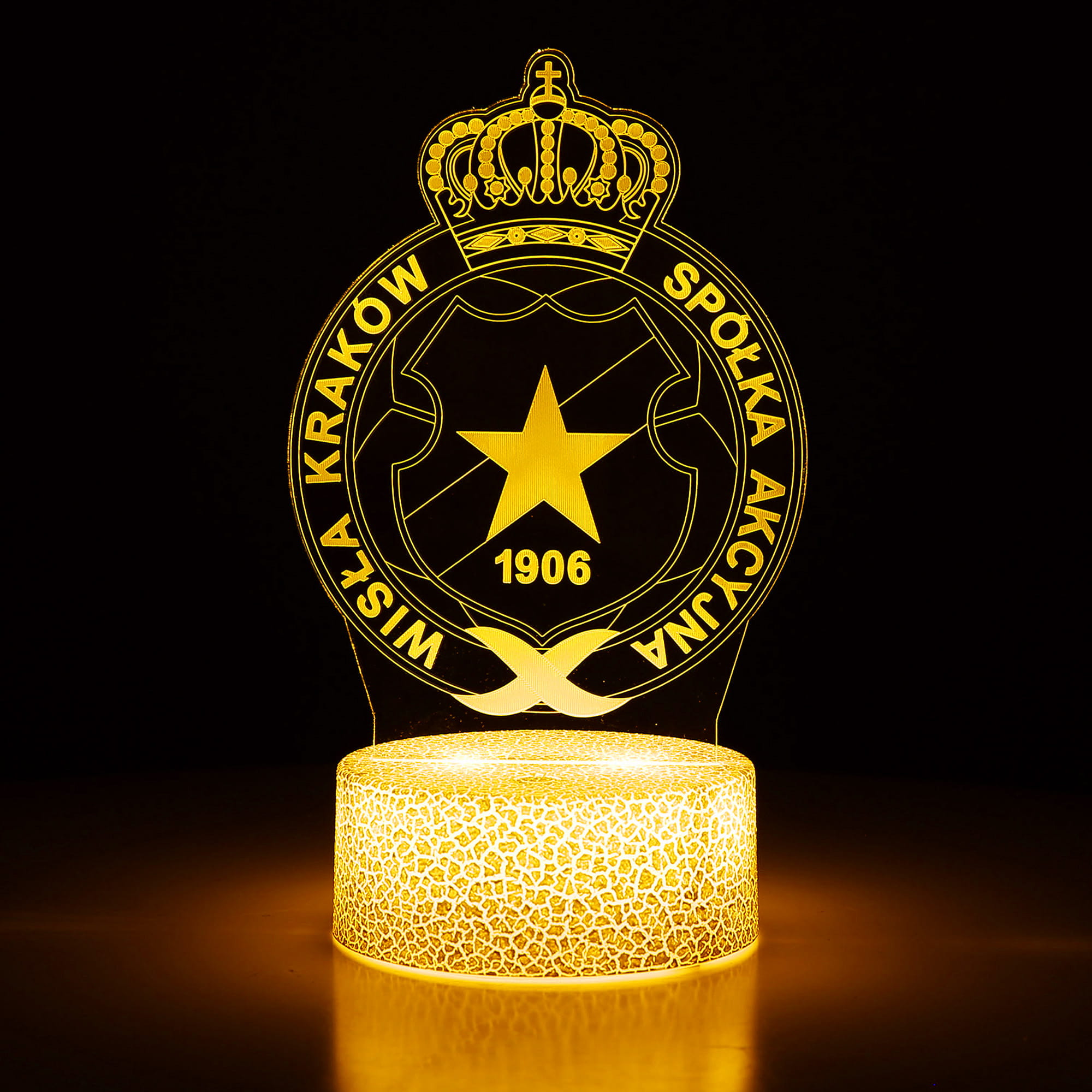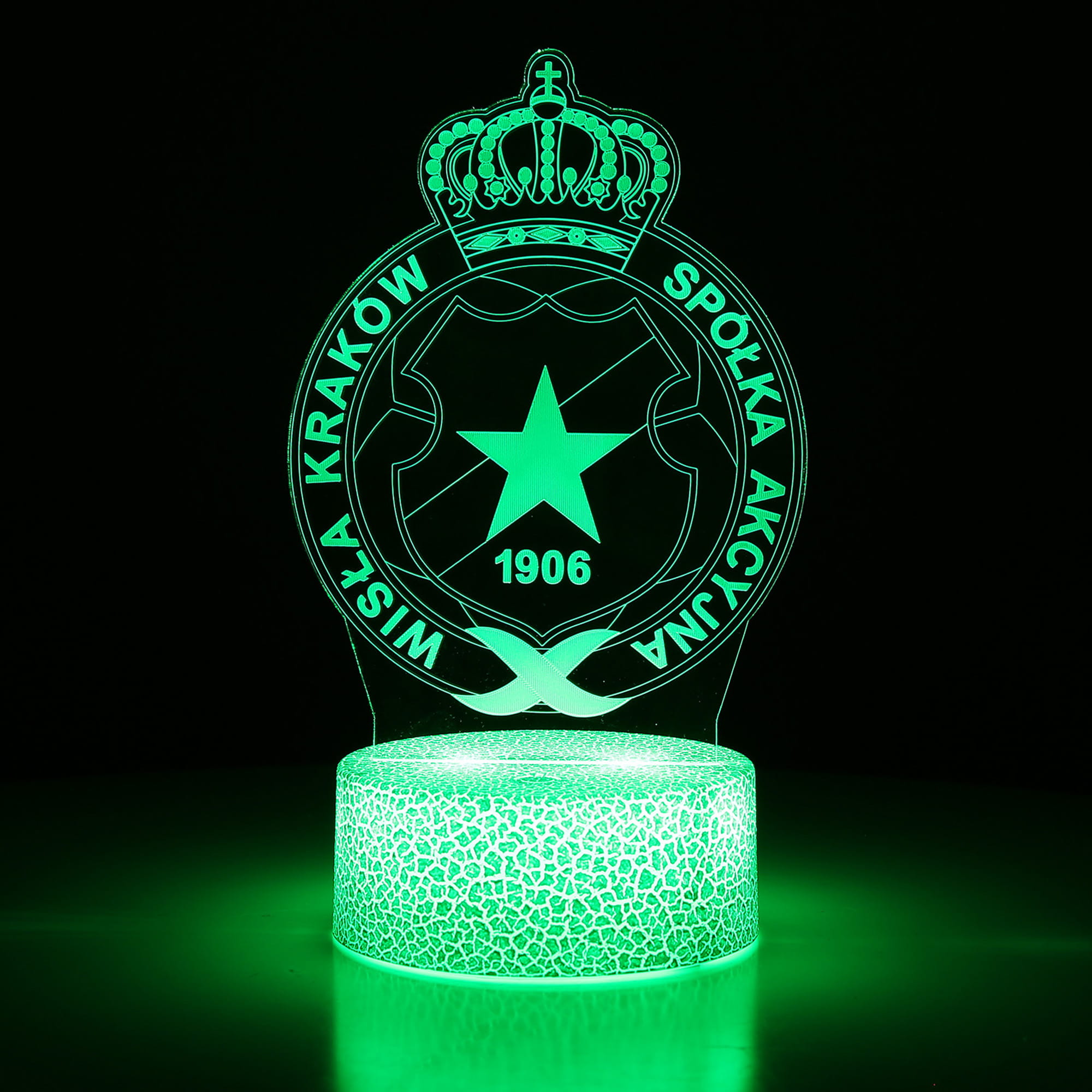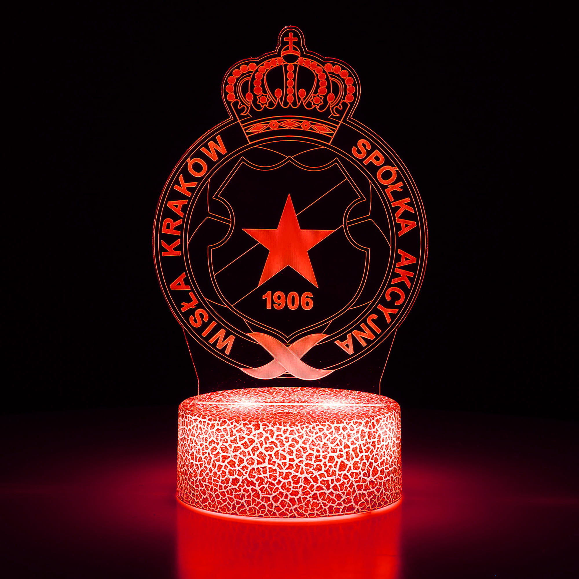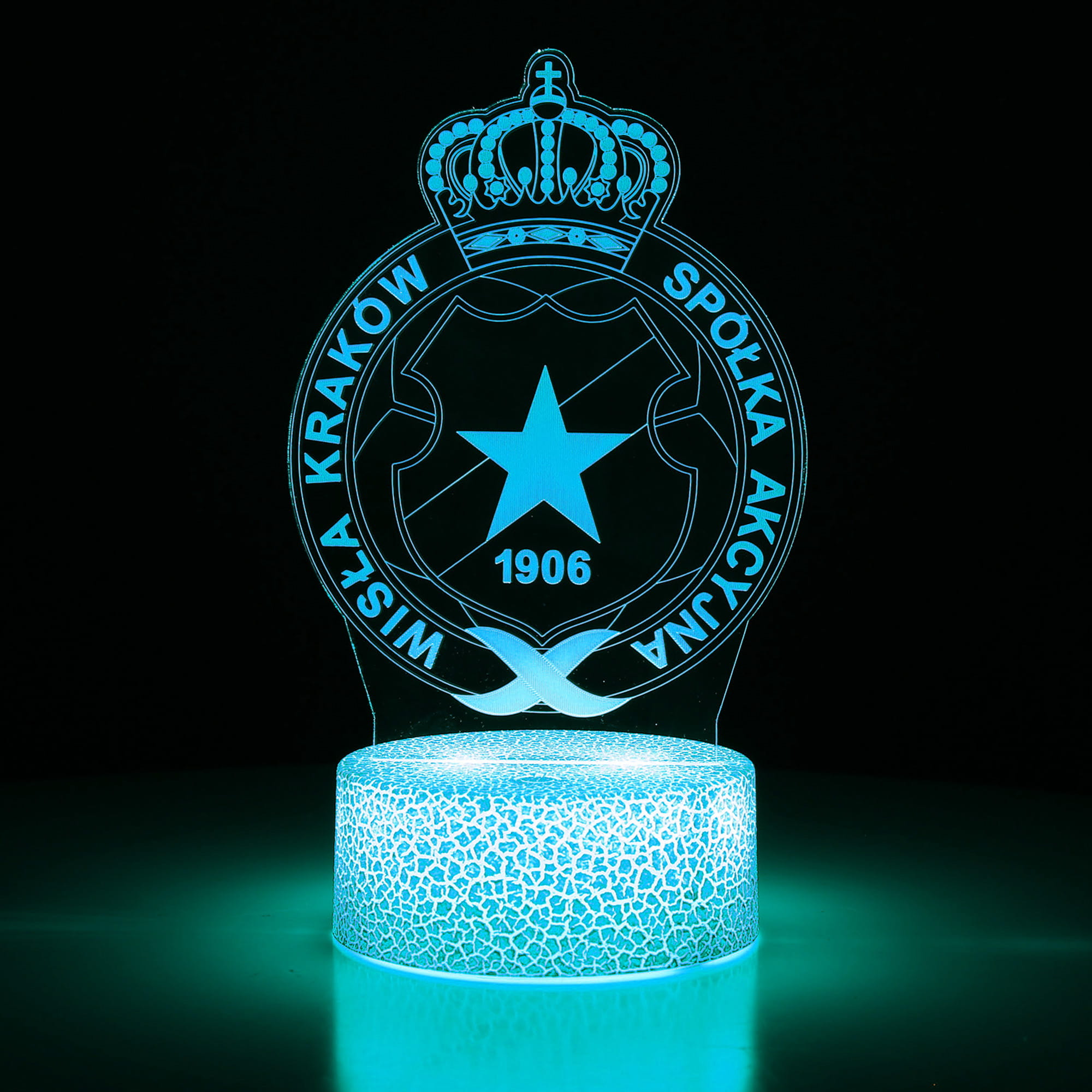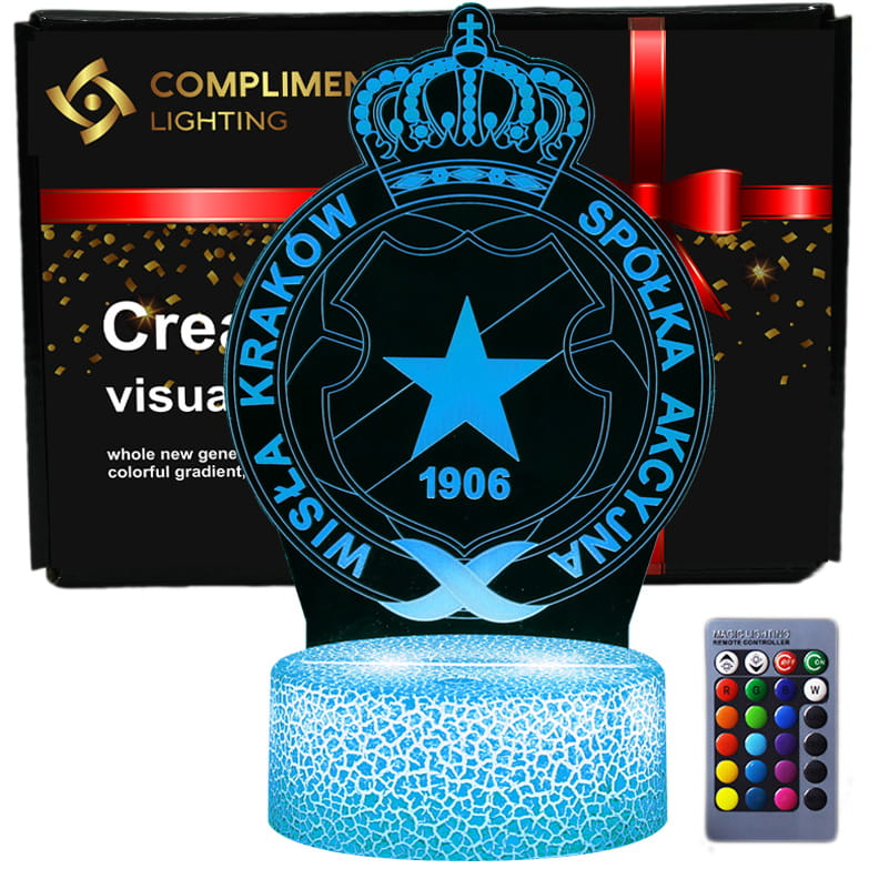 Lampka 3D LED z herbem Wisły Kraków to wyjątkowy gadżet dla każdego fana Białej Gwiazdy. Dzięki efektowi 3D Illusion herb wygląda, jakby unosił się nad podstawą, świecąc w 16 różnych kolorach, które można zmieniać za pomocą pilota lub dotyku. Idealna do pokoju kibica, biura, salonu czy gaming roomu.