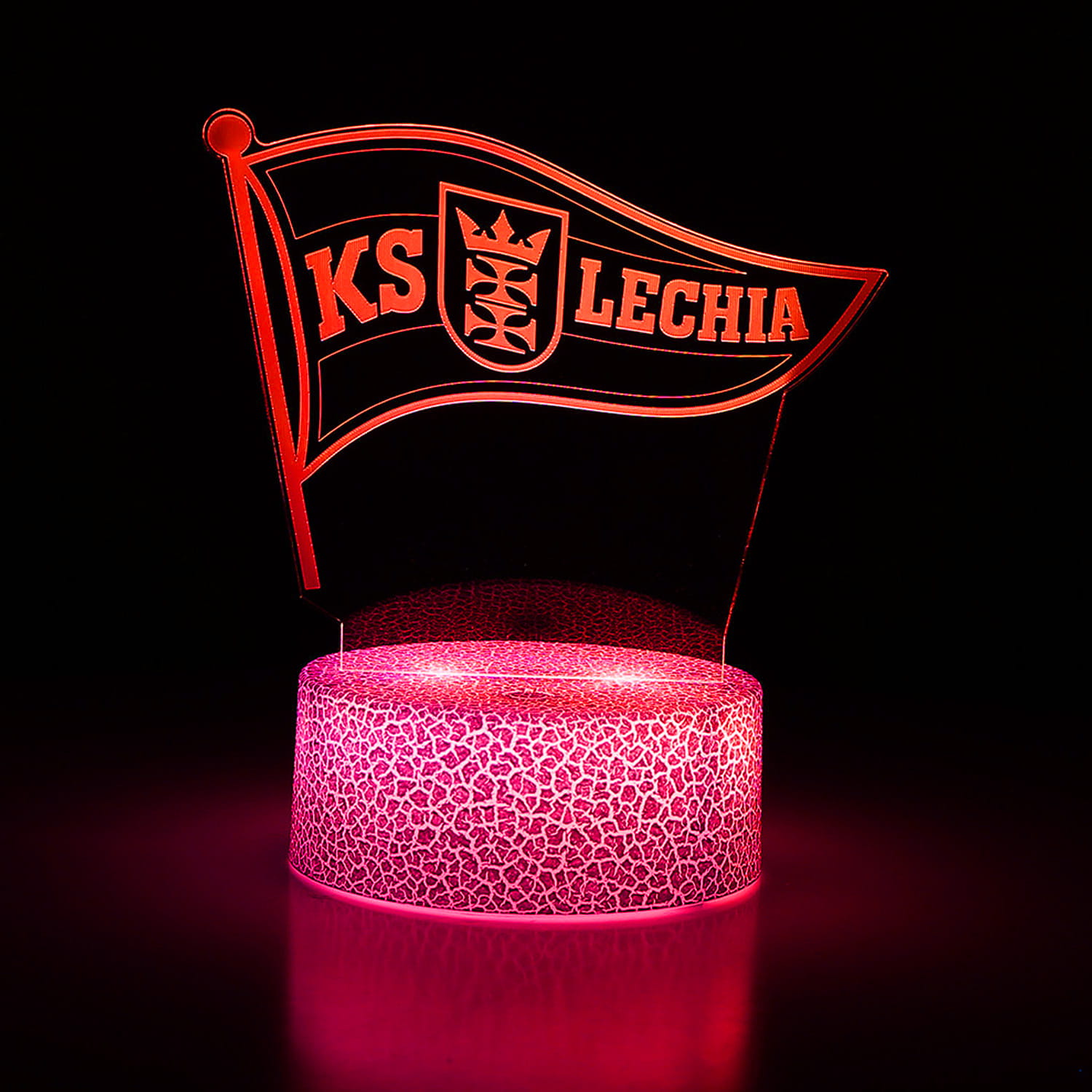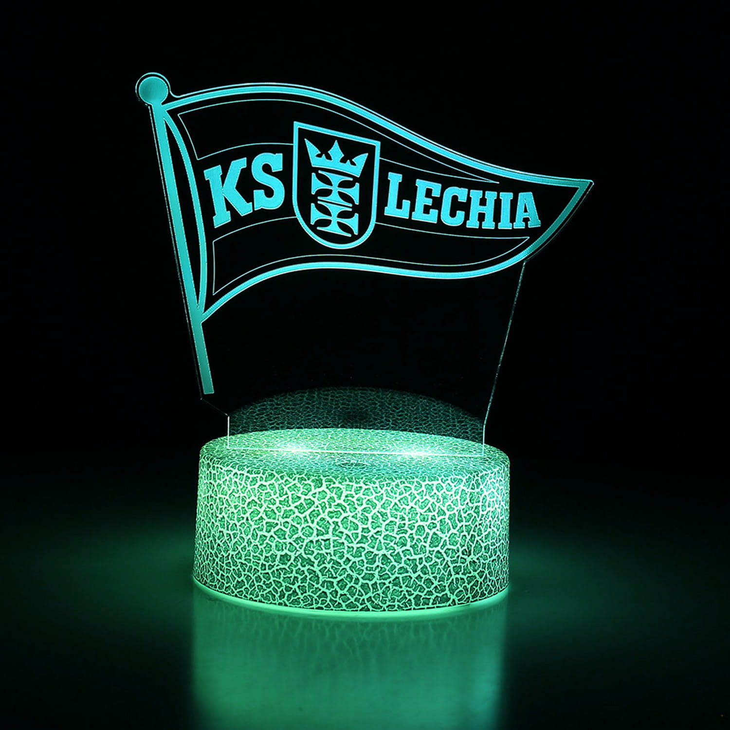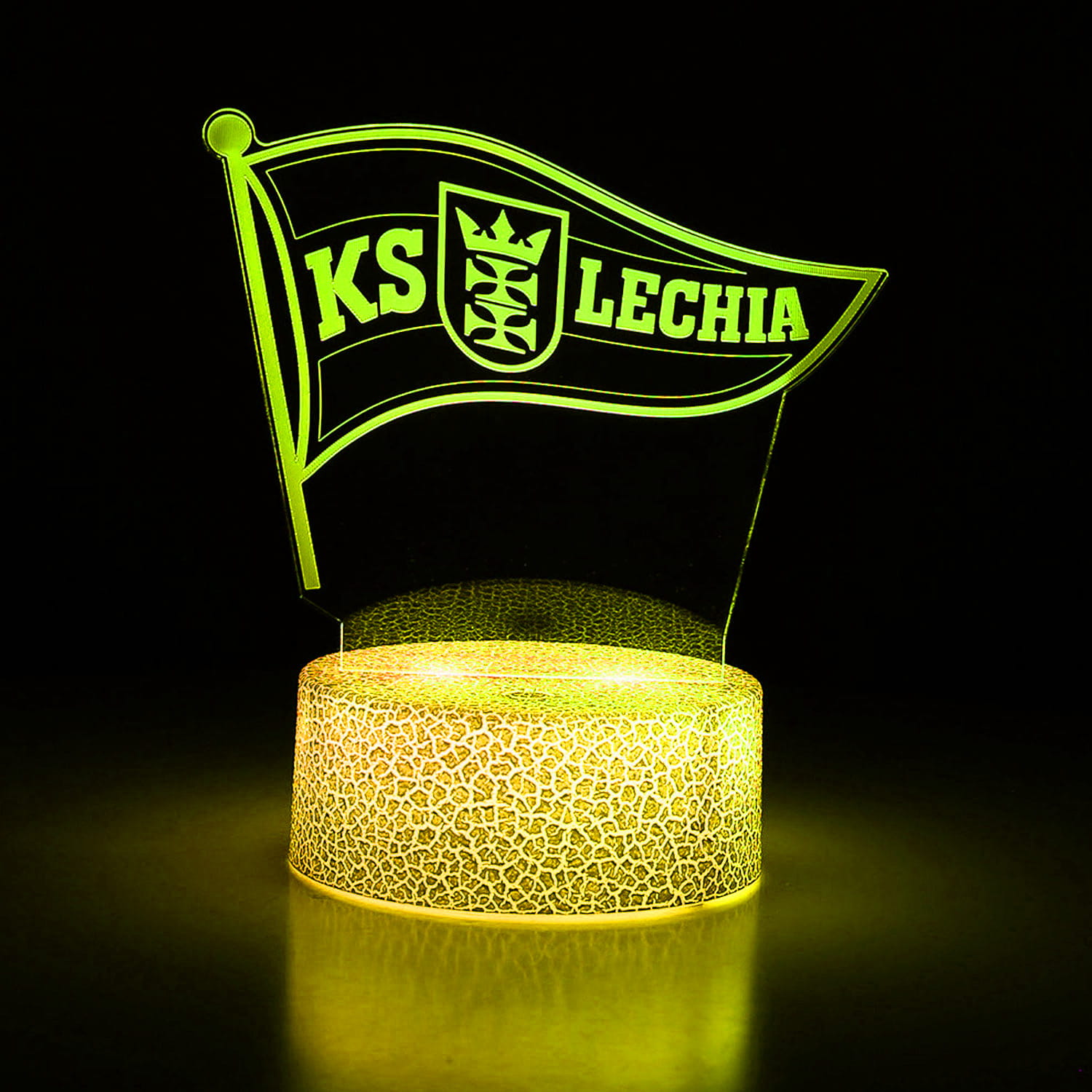 Z herbem KS Lechia Gdańsk i efektem trójwymiarowej iluminacji, ta dekoracja wprowadza unikalny klimat do każdego wnętrza fana. Dzięki technologii 3D Illusion, herb unosi się nad podstawą i świeci w 16 kolorach, które możesz zmieniać za pomocą pilota lub dotykowego panelu.