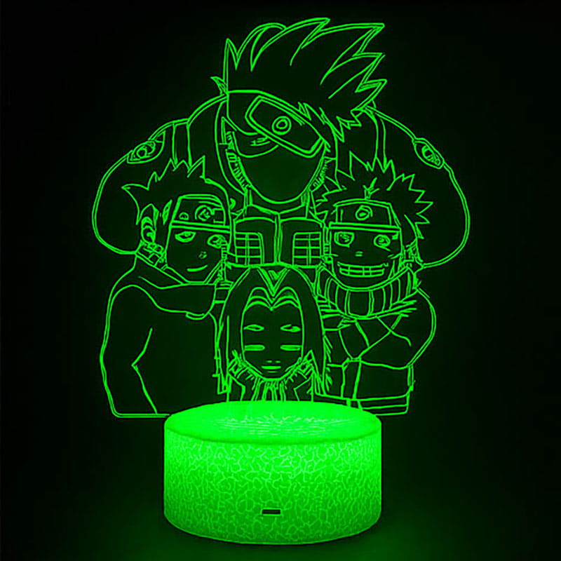 Lampka nocna 3D LED z motywem Naruto, Sasuke, Sakura i Kakashi to hołd dla legendarnej drużyny z anime Naruto Shippuden. Po włączeniu tworzy efekt przestrzennego światła 3D, który ożywia bohaterów w pełnej dynamiki kompozycji.