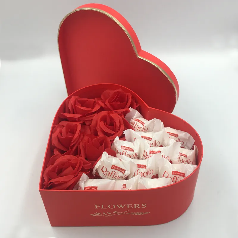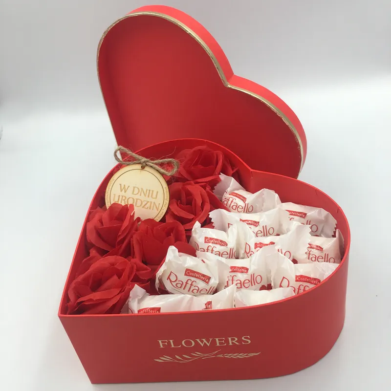 2. Pudełko w kształcie serca wypełnione syntetycznymi różami.