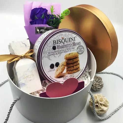 Szukasz idealnego prezentu dla miłośnika herbaty i słodyczej. Z pewnością pokochają ten uroczy zestaw prezentowy! Zestaw zawiera pyszną ciastkę z borówką, herbatę i bukiet z mydłanych kwiatów. I to wshistko zapakowane w złote pudełko na prezent.